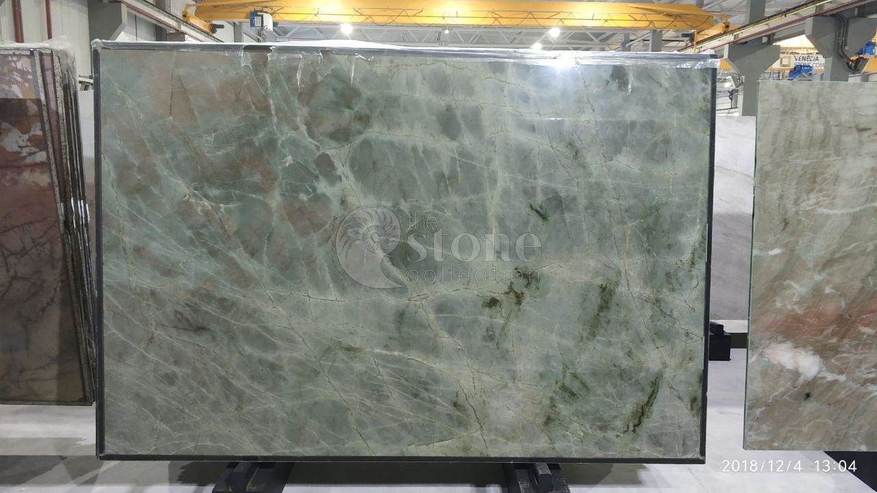 Кварцит насыщенного зелёного оттенка с многослойной кристаллической структурой. Его цвет воспринимается глубоким и благородным, с естественными переходами тона. Камень создаёт ощущение природной силы и свежести. Хорошо подходит для акцентных стен и крупных интерьерных элементов.