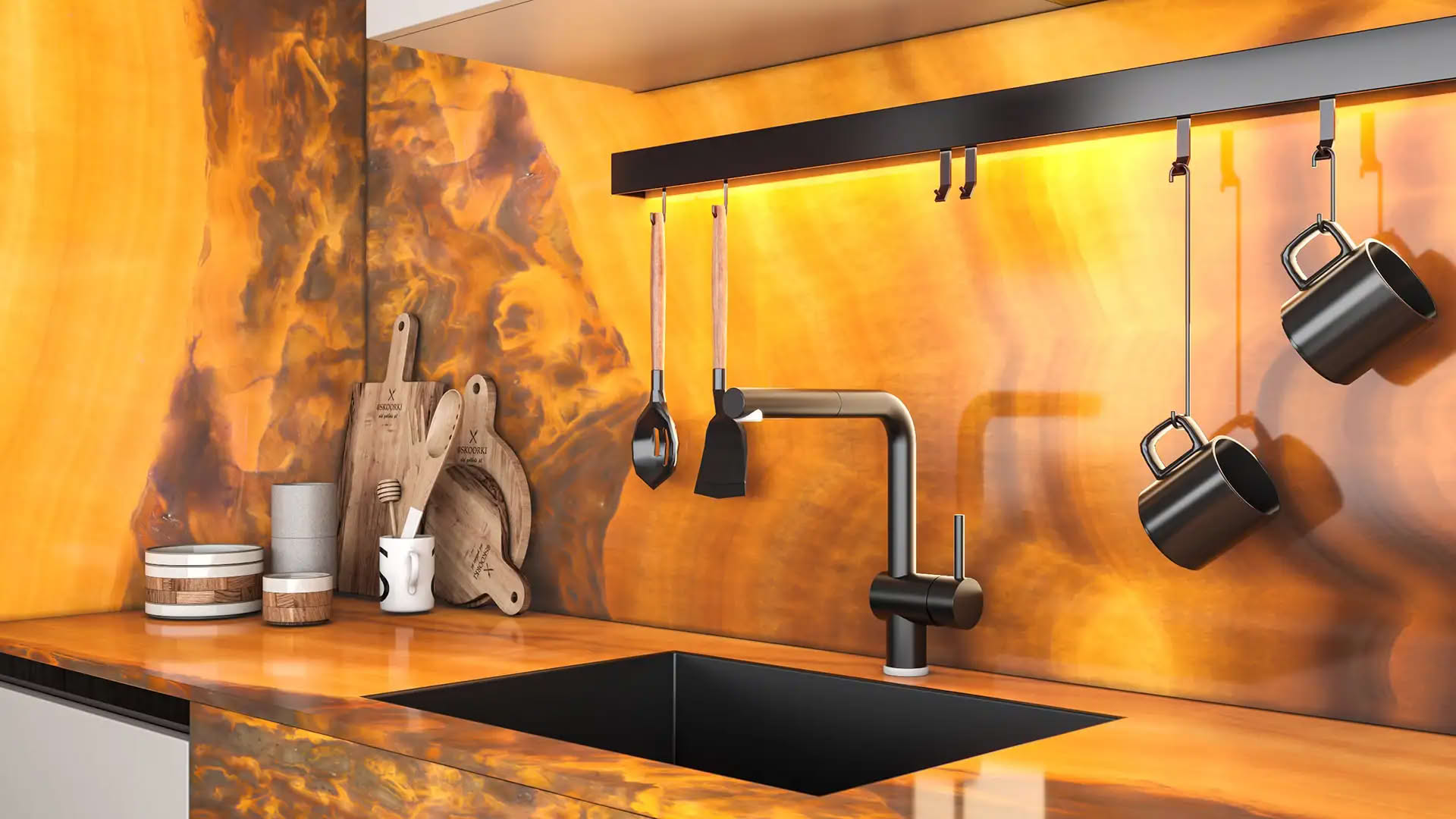 Правильное сочетание цвета камня и подсветки позволяет подчеркнуть естественную текстуру оникса и создать уникальный визуальный эффект.