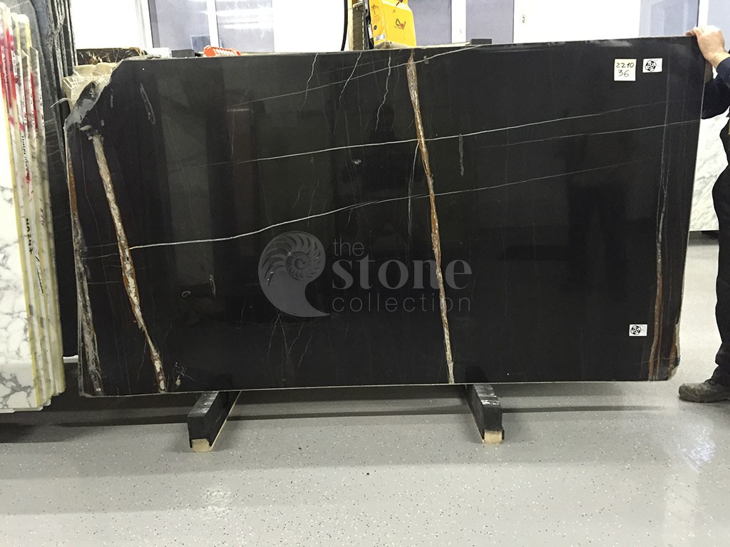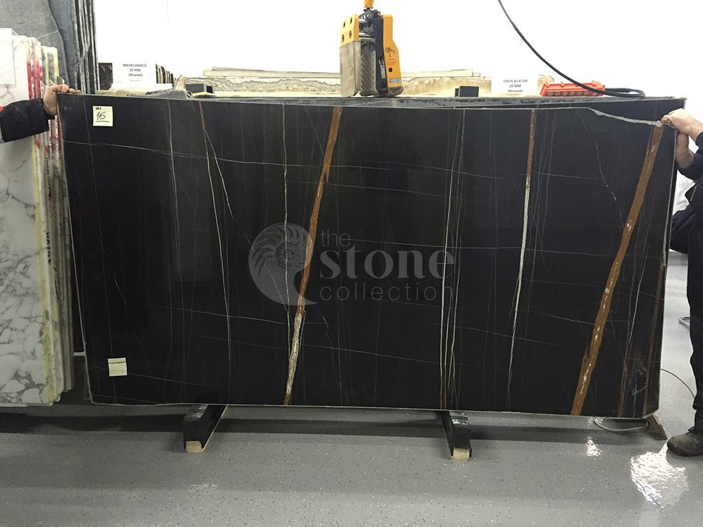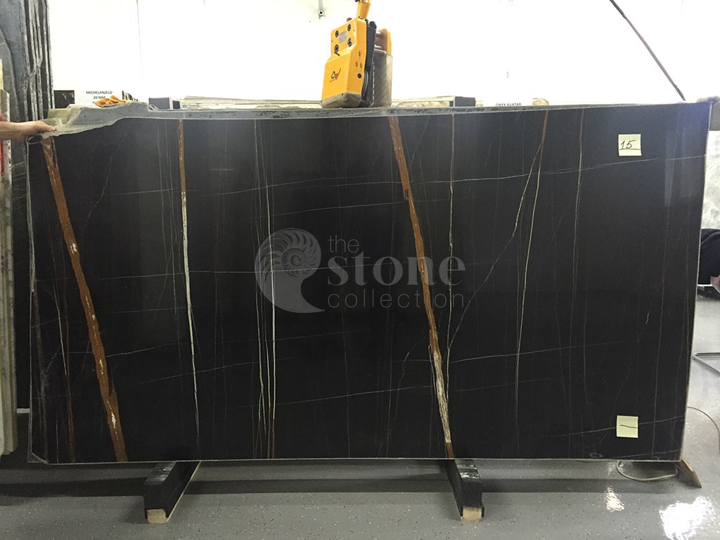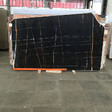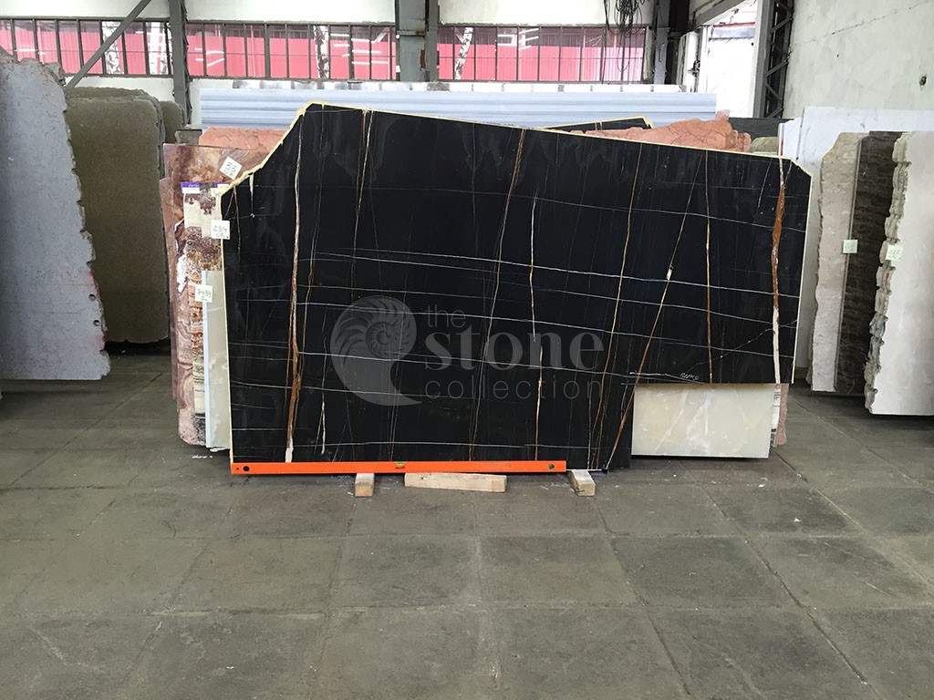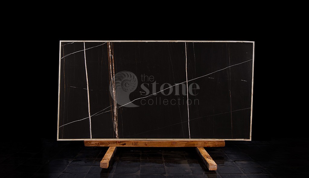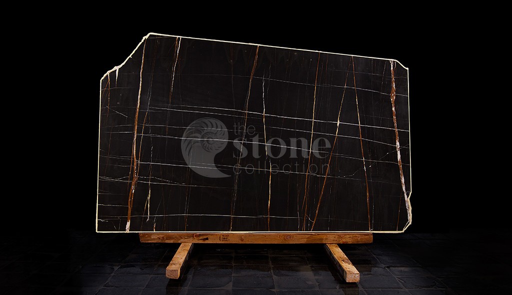 Мрамор Sahara Noir характеризуется глубоким черным фоном с яркими контрастными прожилками, которые могут варьироваться от золотисто-коричневого до белого. Прожилки создают замысловатые узоры, напоминающие органические формы, добавляя камню ощущение движения и визуальный интерес. Уникальные прожилки и окраска этого мрамора делают его похожим на пейзаж или абстрактную картину, вызывая ощущение таинственности и элегантности.