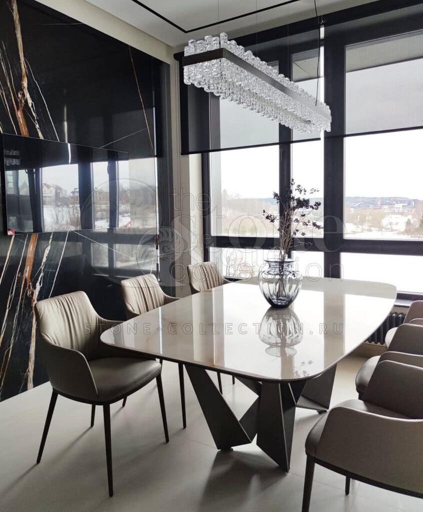 Материал подходит для создания элитной и презентабельной внутренней отделки в роскошных ресторанах, прихожих домов, залах и гостиных. Функциональные характеристики камня позволяют применять его в помещениях с чрезмерной влажностью.